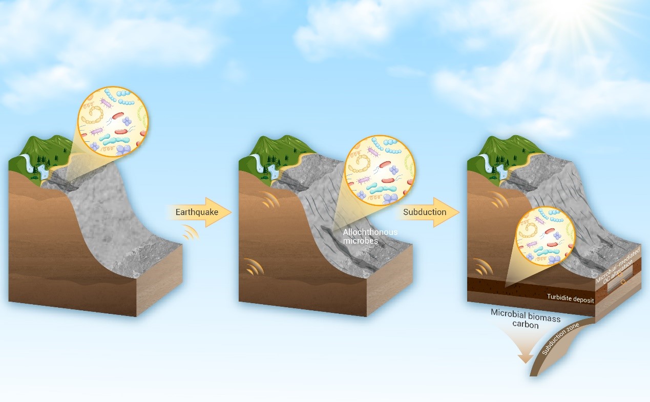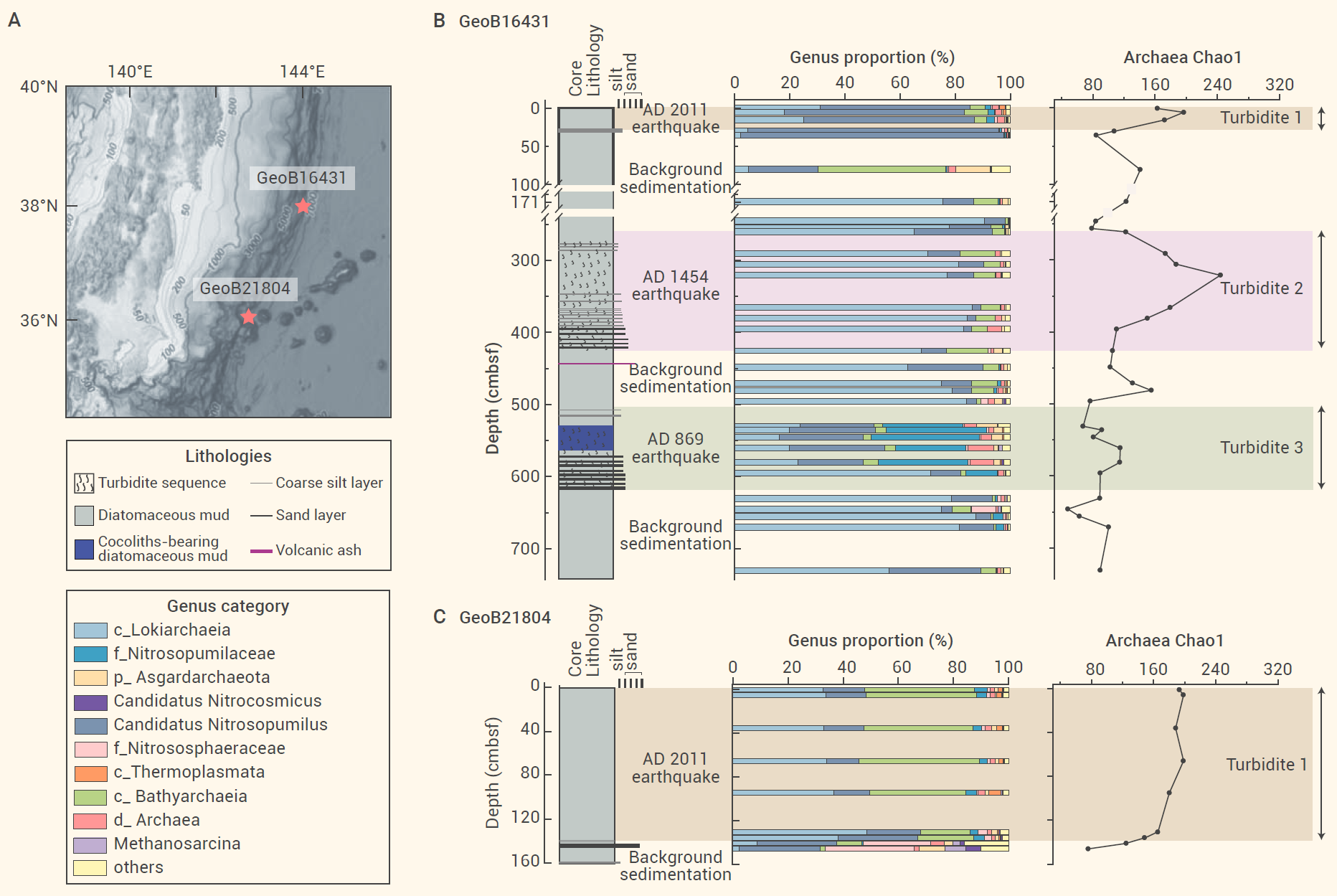 俯冲带板块活动触发了频繁的地震。在俯冲带上方,地震引发海底浊流,造成了大量物质深渊海沟进行横向输送、运移,其中包括附着在沉积物上的微生物。海沟中的深部生物圈参与了超深水环境的物质循环,然而,对于海沟微生物圈组成和性质的调控机制,人类还知之甚少。本研究针对日本海沟沉积物中三次浊流物质样品进行了微生物测序和有机地球化学分析,指出地震对海沟微生物圈的组成和功能有重要的调控作用,地震触发的深海浊流向海沟中引入大量外源微生物,这一过程是地质构造活动影响地球跨圈层物质交换的典型案例。