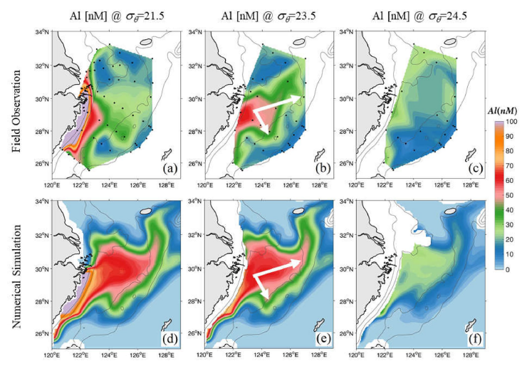 图7 不同密度面溶解态Al及模式模拟长江口染料释放60天后的分布(Wang et al., JGR, 2021) |