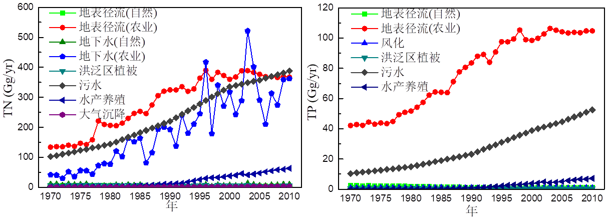 图4 IMAGE-GNM模型模拟的自然和人为来源输送到黄河的 TN和 TP量