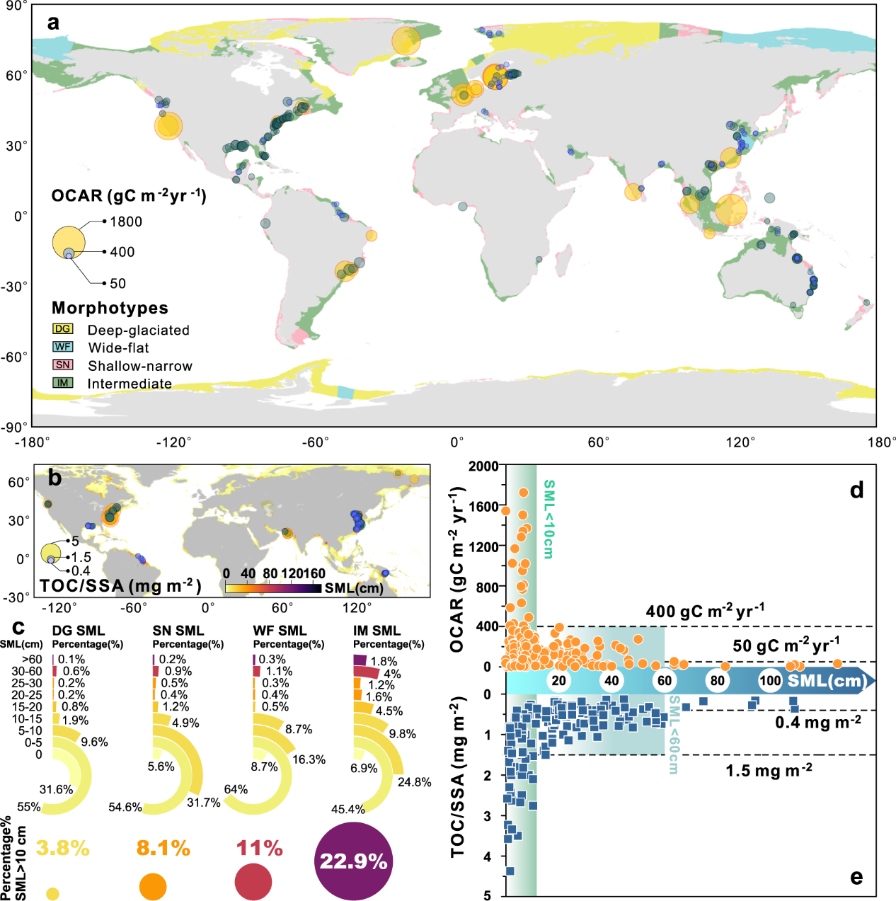 图2 全球近海沉积物扰动层厚度(SML)与有机碳埋藏的相关性分析。(a) 全球近海OCAR分布;(b) 全球近海TOC/SSA分布;(c) 不同海岸带类型的SML厚度分布;(d) SML厚度与OCAR及TOC/SSA的相关关系。(Song et al., NC, 2022)