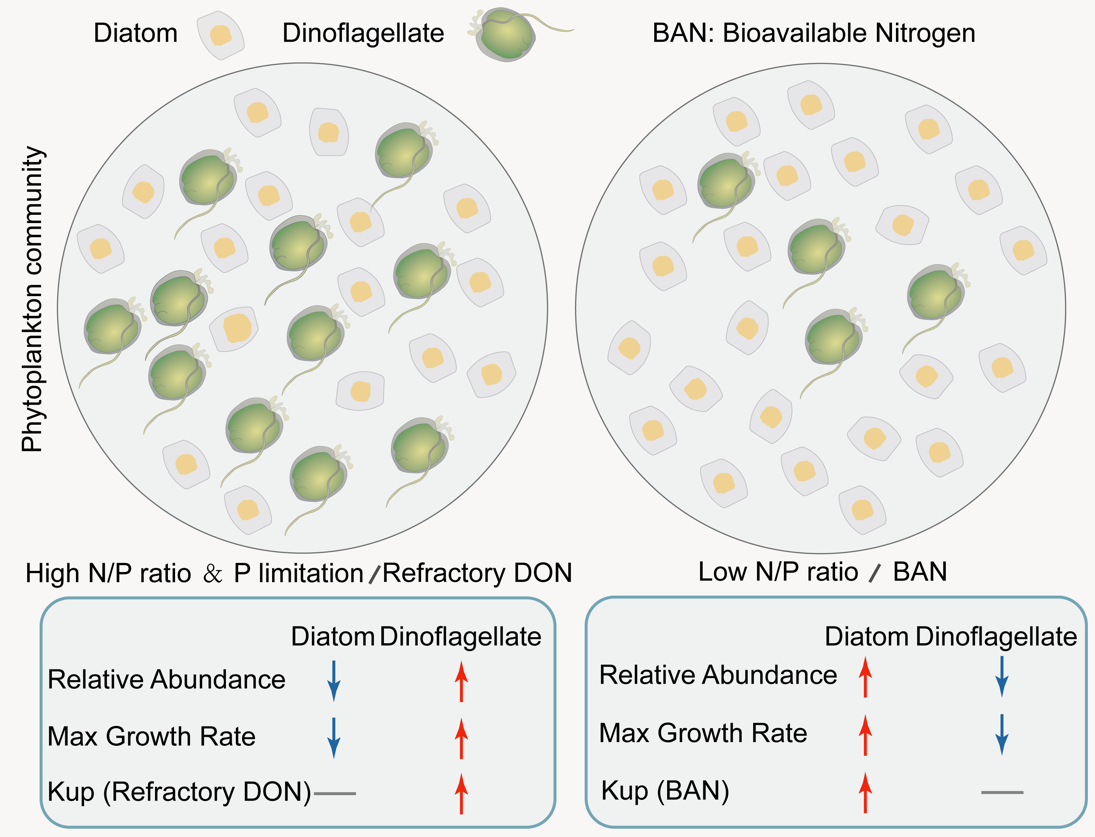 图1:氮磷比、磷限制和不同氮组分对浮游植物群落结构的影响。高氮磷比和磷限制增加了甲藻在群落中的相对丰度,而在低氮磷比下,群落以硅藻为主。甲藻表现出更强的利用RDON的能力,而硅藻表现出更强的利用活性氮的能力(BAN=DIN+LDON)。