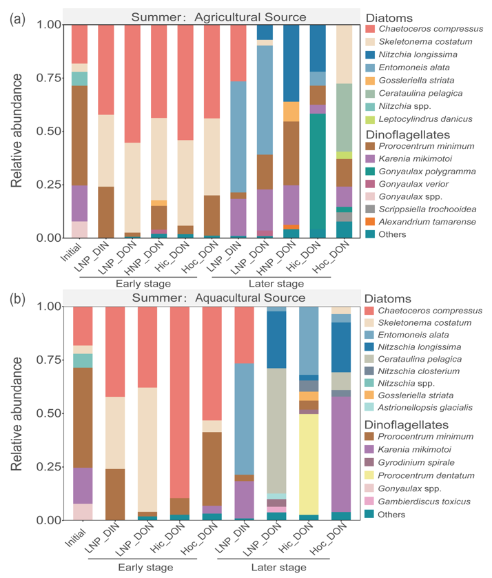 图2:渤海夏季现场培养实验中不同氮加富下浮游植物群落结构的变化(a:农业源,b:水产养殖源)。