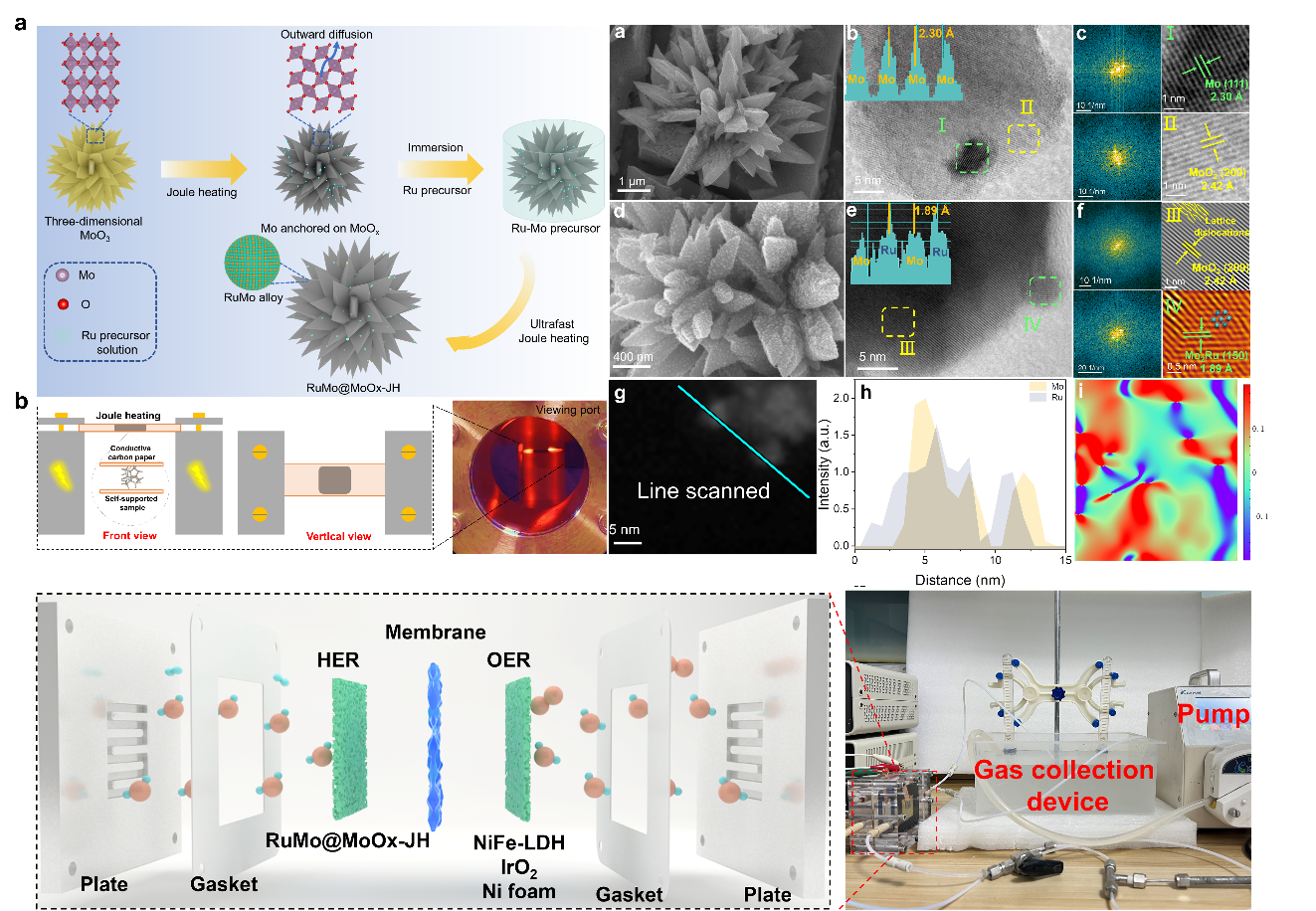 过渡金属Mo基合金因其可调的化学组成、电子结构以及高度的稳定性,被广泛研究并用作析氢电催化剂。通常,在合成过程中,高温(> 1300 K)能够促进合金的形成,为原子分散提供活化能,但也容易引起热力学驱动的原子聚集,进而影响电化学活性与稳定性。基于此,开云电竞网址孟祥超教授课题组提出了利用快速焦耳加热技术精准诱导RuMo合金的形成,实现了RuMo纳米合金在MoO2基底的高分散性构筑,从而合成高活性、高稳定性的合金电催化剂。同时,通过焦耳加热策略引入Ru元素后,催化剂的空位形成能(9.36 eV)以及Mo-o*反键能级能够得到有效的增加和提高,从而抑制了Mo元素的溶解,提升催化剂的稳定性(1 M KOH: 2000 h @ 1A cm-2)。并且,借助于RuMo纳米合金引入的不对称电场,能够有效调控界面水网络(氢键: 30-35; 键长: 2.37 Å-2.39 Å),促使快速的OH转移动力学,进而在电解水制氢方面表现出优异性能(1 M KOH: 256 mV @ 2A cm-2),实现AEM电解槽(RuMo@MoOx-JH(-)||NiFe-LDH(+))的低能耗制氢(3.82 kW h m-3 @ 300 mA cm-2)。这项工作为高分散纳米合金的制备提供了一种普适性的构筑方案,同时,也为理解电催化制氢反应过程机制提供了更多的理论依据。