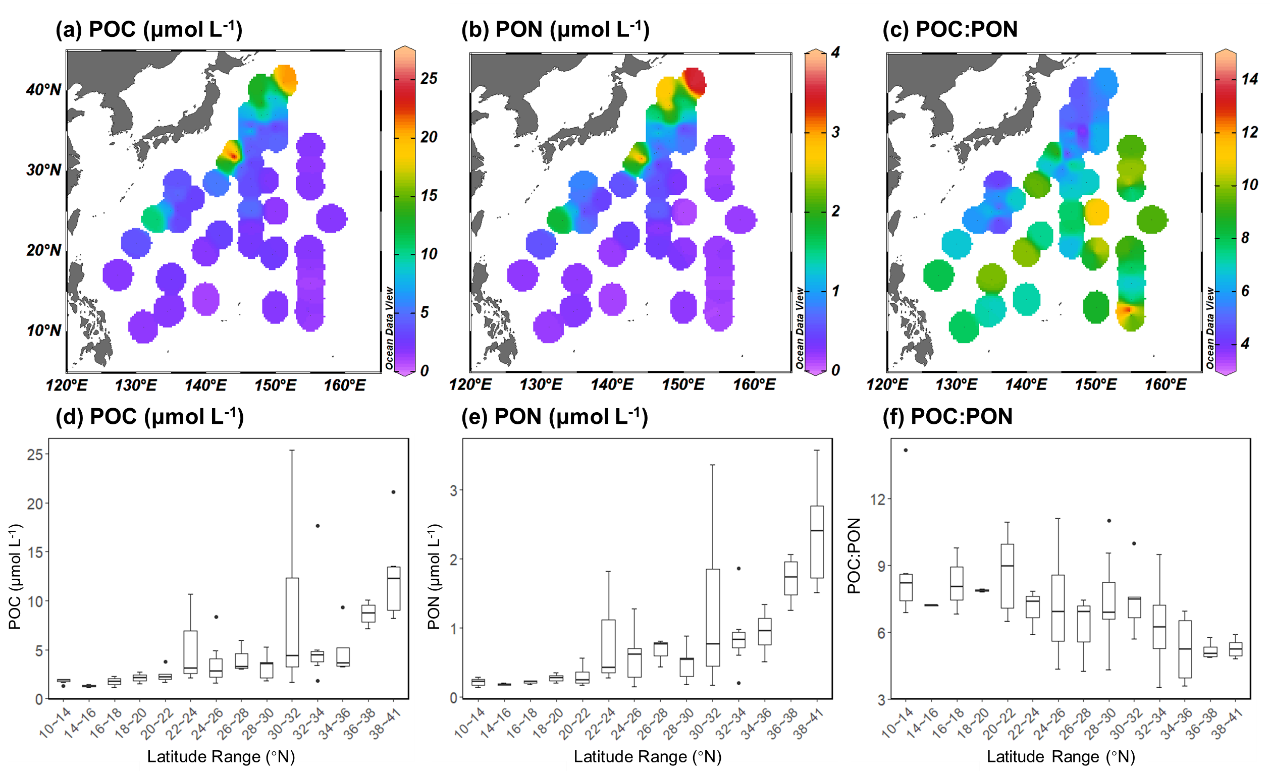 图1 (a)颗粒有机碳(POC);(b)颗粒有机氮(PON);(c)POC:PON;(d-f)三个参数随纬度变化的箱式图