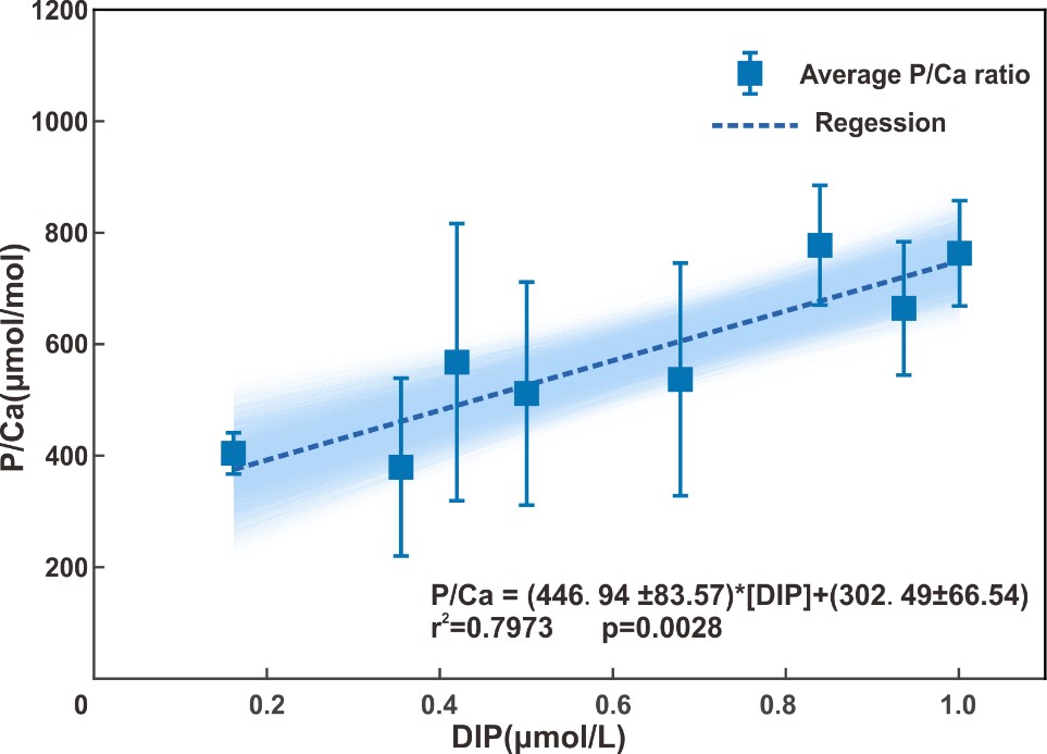 图2 优美花朵虫壳体无孔区P/Ca比值与底层海水DIP浓度的相关关系图