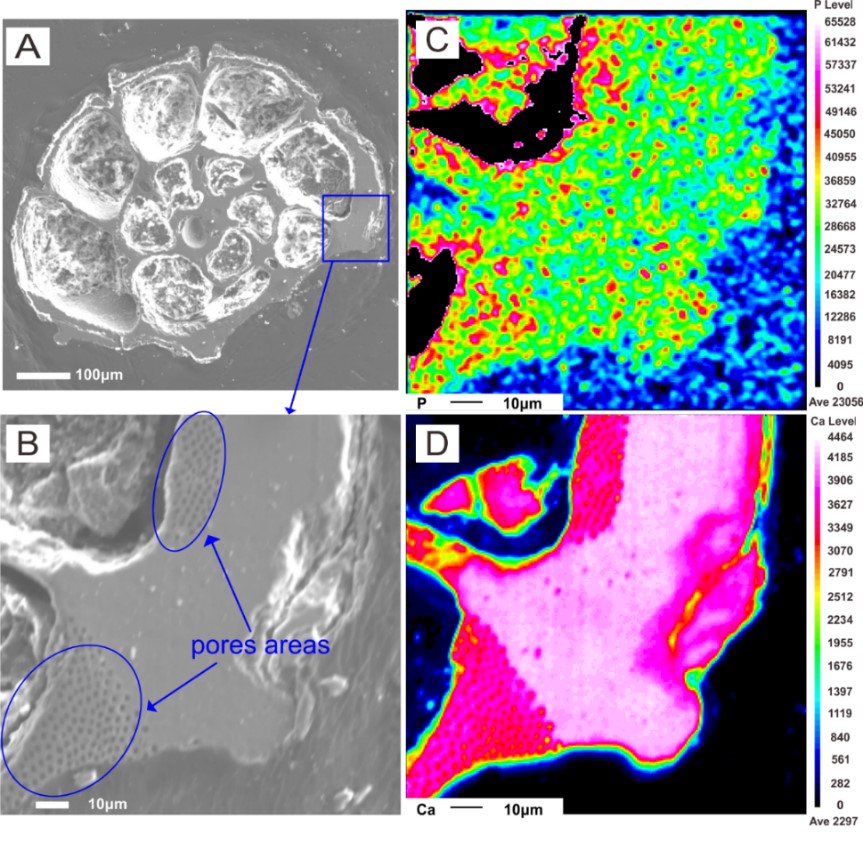 图1 底栖有孔虫壳体横截面的二次电子图像(A和B)和P(C)、Ca (D)的分布图