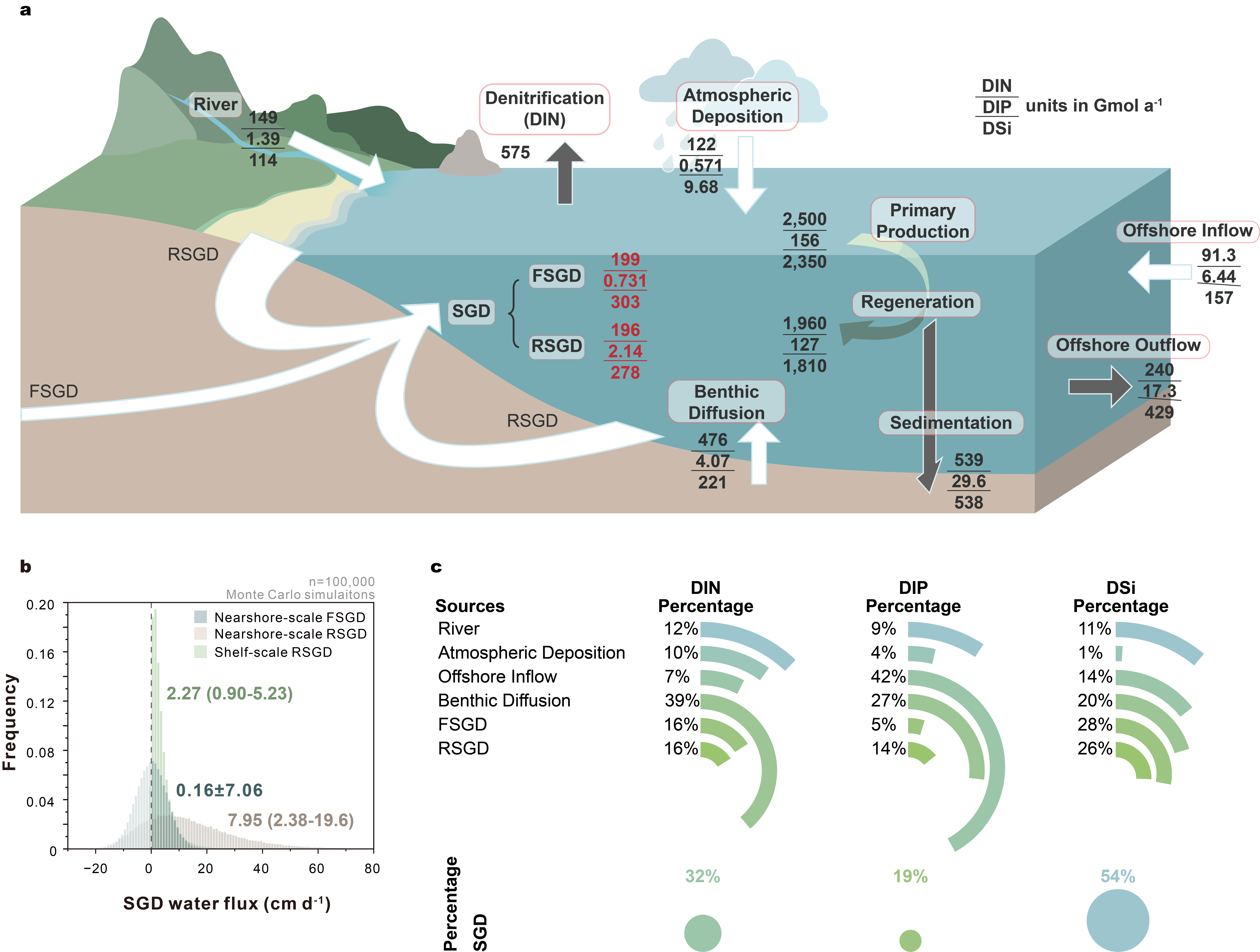 在此基础上,针对我国陆架海域水体构建了营养盐收支模型(图2)。发现总SGD对水体中DIN、DIP、DSi的贡献分别达到32%、19%、54%,超过了河流输入和大气沉降的总和。FSGD通量虽然仅占总SGD通量的2%左右,但其输送入海的营养盐通量却可达总SGD输送通量的50%(DIN)、25%(DIP)、52%(DSi)。地下水端元中的溶解态DIN/DIP/DSi比例(FSGD中为272/1/415;RSGD中为92/1/130)严重偏离了Redfield比值。SGD过程对海域水体富营养化、营养盐结构、赤潮等生态失衡现象的成因具有潜在贡献。本研究揭示了海底边界交换过程对我国近海生源要素生物地球化学循环的重要贡献,对制定合理的海洋可持续发展措施具有重要的科学意义。