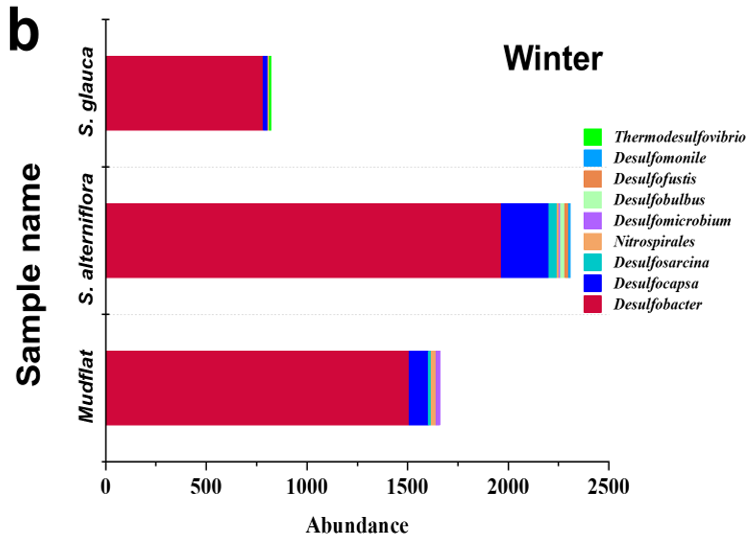 图3 夏季(a)和冬季(b)不同实验区沉积物中硫代谢相关的9种微生物的丰度分布