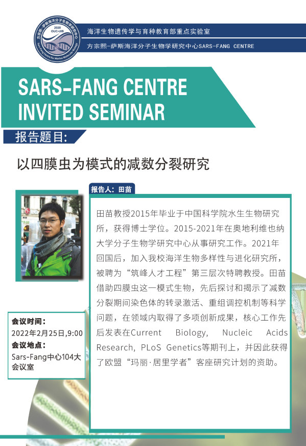 田苗教授2015年毕业于中国科学院水生生物研究所,获得博士学位。2015-2021年在奥地利维也纳大学分子生物学研究中心从事研究工作。2021年回国后,加入我校海洋生物多样性与进化研究所,被聘为“筑峰人才工程”第三层次特聘教授。田苗借助四膜虫这一模式生物,先后探讨和揭示了减数分裂期间染色体的转录激活、重组调控机制等科学问题,在领域内取得了多项创新成果,核心工作先后发表在Current Biology, Nucleic AcidsResearch, PLoS Genetics等期刊上,并因此获得了欧盟“玛丽·居里学者” 客座研究计划的资助。