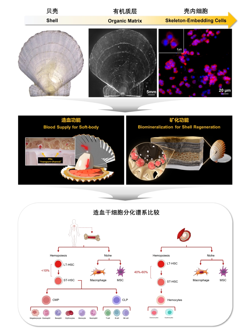 破解该谜题的关键突破口,源于研究团队在一次实验“失误”中取得的意外发现:在用常规软体组织核酸提取方法处理新鲜贝壳的过程中,意外检测到大量具有生物活性的RNA分子,暗示贝壳中存在大量活细胞,并非“无生命的石头”。面对从坚硬、不透明贝壳中研究细胞功能的巨大技术挑战,团队经过多年攻关,成功建立了适用于无脊椎动物外骨骼的干细胞研究体系,并最终通过多组学遗传解析、细胞体外培养和诱导分化、活体动物细胞示踪和功能验证等系统性证据层面揭示了贝壳内存在造血干细胞巢,取得以下原创性发现: