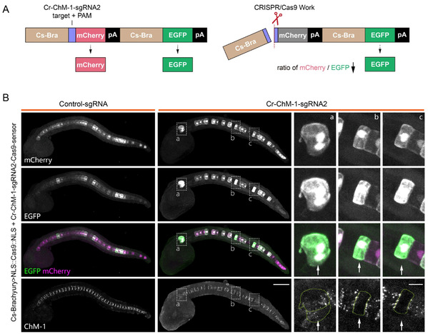 图4: 通过本研究构建的Cas9-sensor在玻璃海鞘(Ciona robusta)脊索细胞中实现基因编辑事件的可视化监测