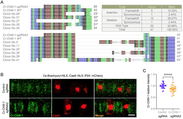 (2)在海鞘中开发了可追踪的基因编辑工具,实现了海鞘组织特异性基因敲除(图3)。该系统由组织特异性启动子驱动,利用氨基端和羧基端融合的核定位信号(NLS)促使Cas9蛋白定位于细胞核中,提高切割宿主基因组DNA的效率。同时,利用P2A自剪切肽实现Cas9和荧光蛋白mCherry的共表达,且在指示Cas9表达细胞的同时减少融合标签对Cas9蛋白活性的影响,作者利用该系统成功敲除了玻璃海鞘脊索细胞中的ChM-1基因。该编辑工具可有效追踪Cas9表达细胞并识别海鞘脊索细胞中的基因编辑事件,展示了其在细胞分辨率下开展可追踪基因编辑与功能研究的潜力。