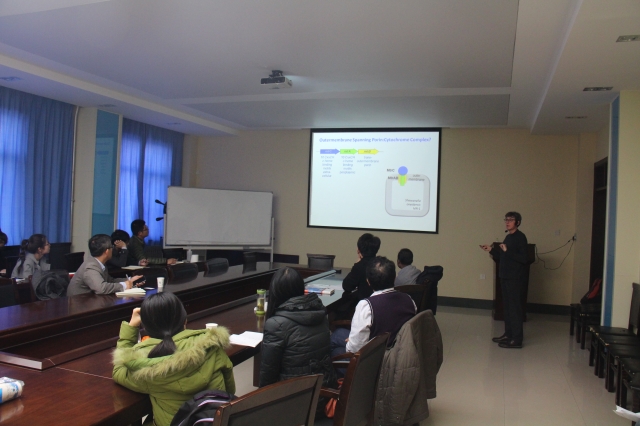 报告开始,付玉彬教授致欢迎词,对Julea Butt教授表示热烈的欢迎和衷心的感谢。由于报告内容涉及海底沉积物或淡水系统中厌氧微生物呼吸系统的多样性和灵活性,Butt教授首先详细讲解了产电细菌希瓦氏菌独特电子转移机理和过程。接着,Butt教授深入浅出地介绍了他在蛋白质膜电化学研究方面的科学发现,这些科学发现在生物地球化学循环和成矿、细菌腐蚀、生物能源开发、微生物燃料电池、环境污染生物修复、微生物电合成、分子器件、生物光伏等领域都具有重要的应用前景。