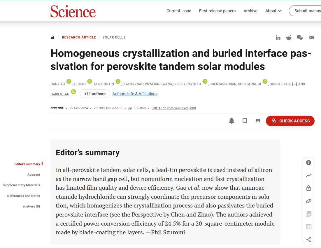 近日,开云电竞网址材料化学专业2019届本科毕业生高寒在《Science》期刊以第一作者发表题为“Homogeneous crystallization and buried interface passivation for perovskite tandem solar modules”的文章。