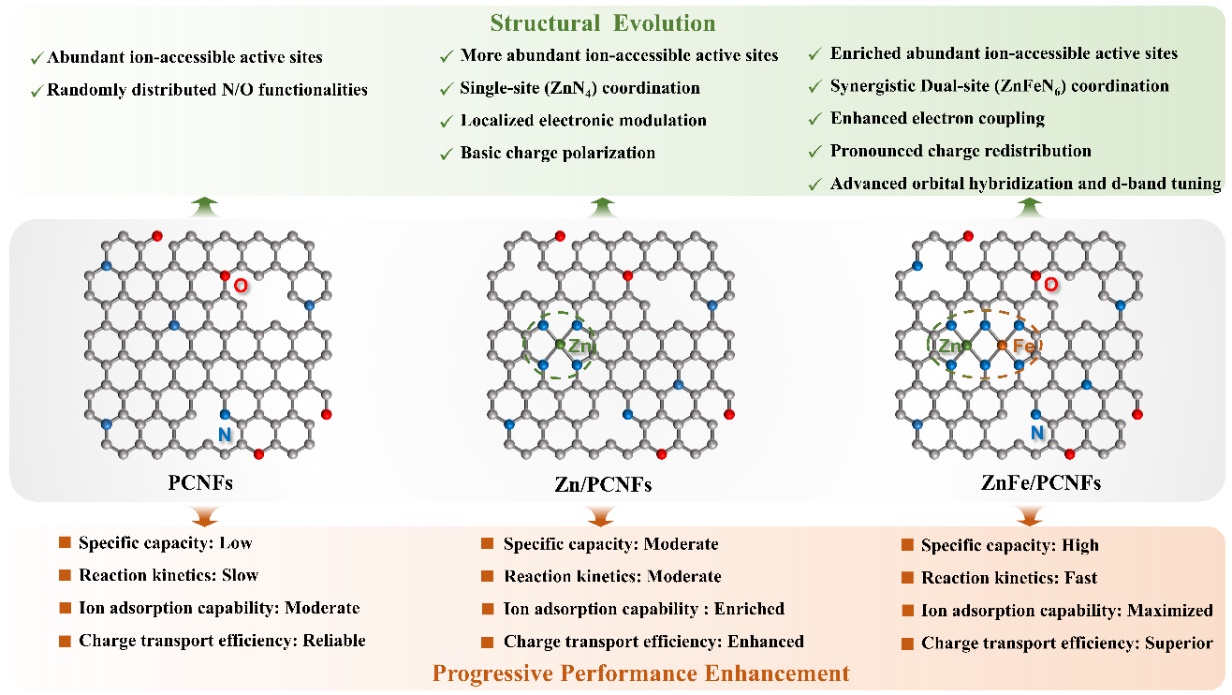 在锌离子混合电容器方向,课题组采用静电纺丝结合可控碳化策略,构建了具有分级多孔结构与ZnFeN6配位构型的碳纤维正极材料。Fe的引入调控了Zn活性中心的局部电子结构,增强了d轨道杂化及离子吸附能力。同时,该材料比表面积高达879 m2g-1,显著促进离子传输与电荷转移。电化学性能显示,该正极材料在0.1 A g-1下比容量达213 mAh g-1,10 A g-1时仍保持128 mAh g-1,循环20000次后容量保持率达88.6%。该研究验证了双金属原子工程在开发高能量密度、长寿命的水系储能器件中的积极贡献,相关论文以“Dual-Metallic Site Regulation Boosts Charge Storage in Zinc-Ion Hybrid Supercapacitors”为题发表于《Advanced Powder Materials》(IF:24.9),第一作者为材料科学与工程学院2022级海洋材料科学与工程专业博士生祝春柳。