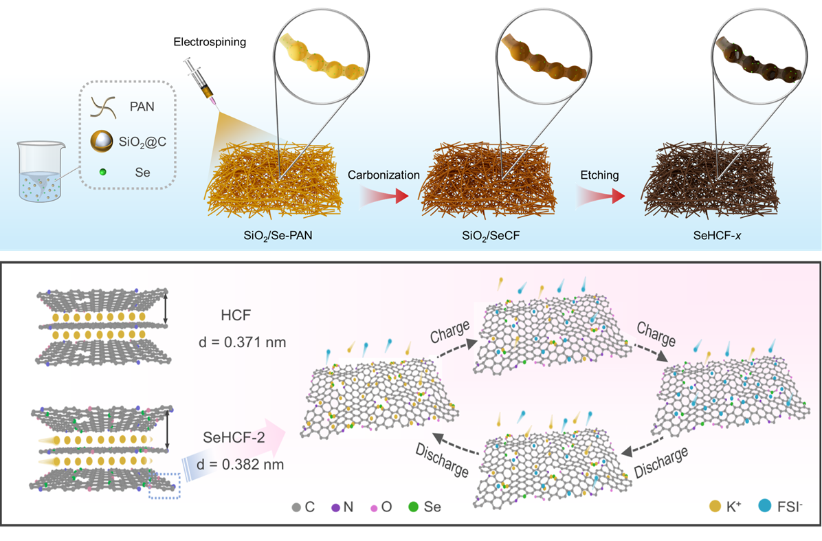 针对钾离子电池碳负极体积效应与反应动力学缓慢等问题,课题组利用静电纺丝技术制备了珍珠项链状Se掺杂空心碳纳米纤维。空心结构提高了电解液浸润与离子传输效率,Se掺杂则创造了丰富缺陷与活性位点,显著提升了钾离子扩散速率和储存能力。该负极材料在0.05 A g-1下实现470 mAh g-1的高比容量,在5 A g-1下循环6000次后仍保持167 mAh g-1。基于该材料组装的钾离子混合电容器能量密度达145 Wh kg-1,循环10000次后容量保持率为85%。相关研究以“Pearl-Necklace Structured Se-Doped Hollow Carbon Nanofibers for High-Capacity and Ultrastable Potassium Ion Storage”为题发表于《Green Energy & Environment》(IF:14.6),第一作者为材料科学与工程学院2023级材料科学与工程专业硕士生路亚力。