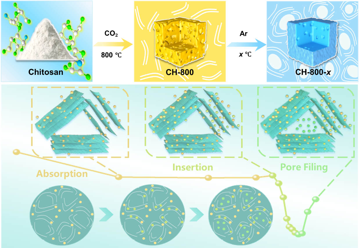 针对钠离子电池用硬碳负极材料,课题组提出了一种CO2刻蚀与高温碳化协同调控策略,成功制备出具有丰富闭孔结构的硬碳材料。该策略以富氮壳聚糖为前驱体,先经CO2刻蚀形成开孔,再通过二次热处理重组为闭孔结构。氮元素的引入不仅稳定了碳骨架,还提升了闭孔保留效率与平台区储钠能力。优化后的硬碳负极在0.05 A g-1电流密度下实现了388.8 mAh g-1的高可逆比容量,循环 800次后容量保持率仍达83.8%,全电池能量密度达165.2 Wh kg-1。相关研究以“Synergistic CO2 etching and carbonization induces closed-pore structures for plateau-dominant sodium storage”为题发表于《Nano Research》(IF:9.0),材料科学与工程学院2023级材料工程专业硕士生任万澄与2022级海洋材料科学与工程专业博士生杨磊为共同第一作者。