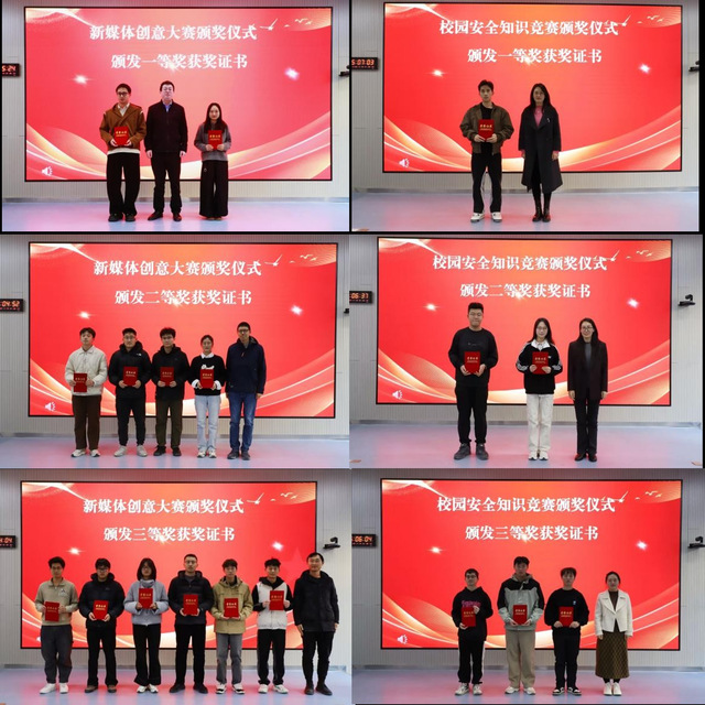 颁奖仪式上,与会嘉宾为新媒体创意大赛、校园安全知识竞赛获奖学生代表颁发了证书。