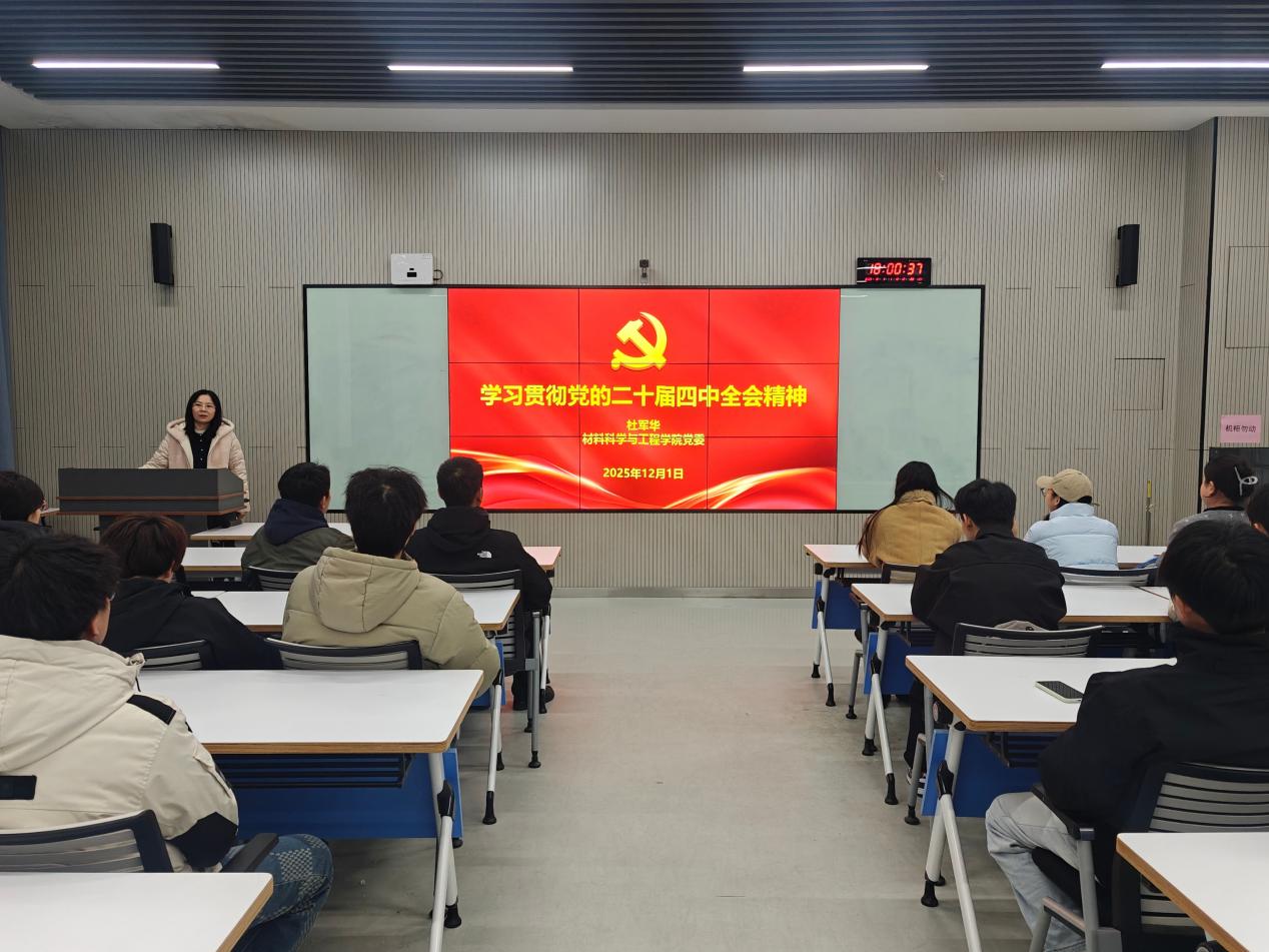 12月1日,材料科学与工程学院党委书记杜军华以“学习贯彻党的二十届四中全会精神”为主题,在材料楼108教室为2025级材料工程硕士1班讲授形势与政策课。