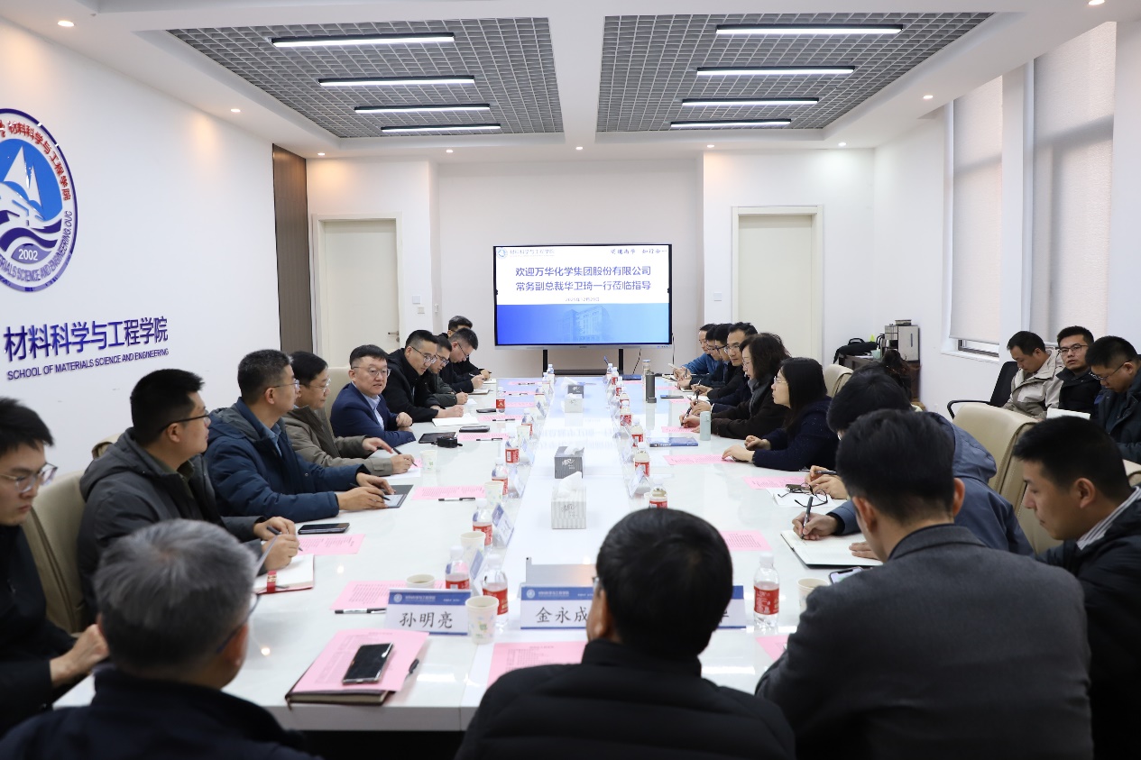 12月29日下午,万华化学集团股份有限公司(以下简称“万华化学”)常务副总裁华卫琦一行到材料科学与工程学院调研交流,学院党委书记杜军华、院长崔洪芝参与交流。
