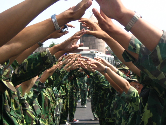 04级工程管理的同学站成两排,用双手为教官搭起一道离别的"走廊".