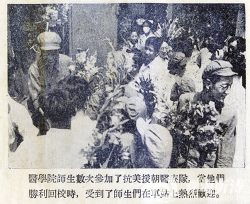 1951年3月1日,学校医学院和附属医院32名参加首批抗美援朝医疗队的医师、技师、护士启程,他们被编入“中国红十字会国际医防服务队第二大队”。(1951年8月4日第一批赴朝医疗队胜利归来后,受到全校师生的热烈欢迎,学校还在职工俱乐部举行联欢会,校长华岗,副校长童第周参加了联欢会)6月12日第二批 13名医师、护士、工人启程。9月25日第三批医疗队6名医师、护士、学生启程。12月12日,参加国防战线医务工作的5名医师、技师、护士启程。