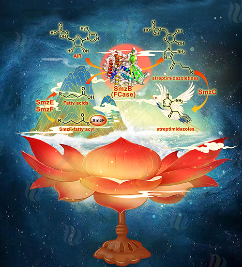 本文在发现7个新的4-酰基-5-氨基咪唑生物碱(AAIAs)类天然产物的基础上,首次解析了AAIAs的生物合成途径,并揭示了AAIAs类天然产物来自两个初级代谢(嘌呤代谢与脂肪酸代谢)之间的对话与互作,从中发现了一个独特而新颖的FCase-SmzB,突破了目前FCase的芳香底物的结构限制,为此类生物碱的结构拓展及生物合成与应用提供了重要思路。
