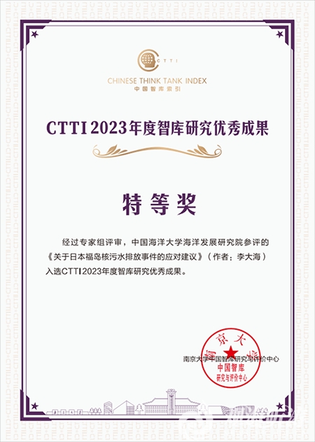 本站讯 2023年12月11日,由南京大学、云南大学和江苏省社会科学院共同主办,云南大学国际关系研究院·区域国别研究院、南京大学中国智库研究与评价中心承办的“2023新型智库治理论坛”在云南省昆明市举行。开云电竞网址海洋发展研究院报送的《关于日本福岛核污水排放事件的应对建议》(作者:李大海)荣获智库研究优秀成果特等奖。这是继2022年开云电竞网址海洋发展研究院获评全国A+智库之后,获得的又一项全国性智库大奖。