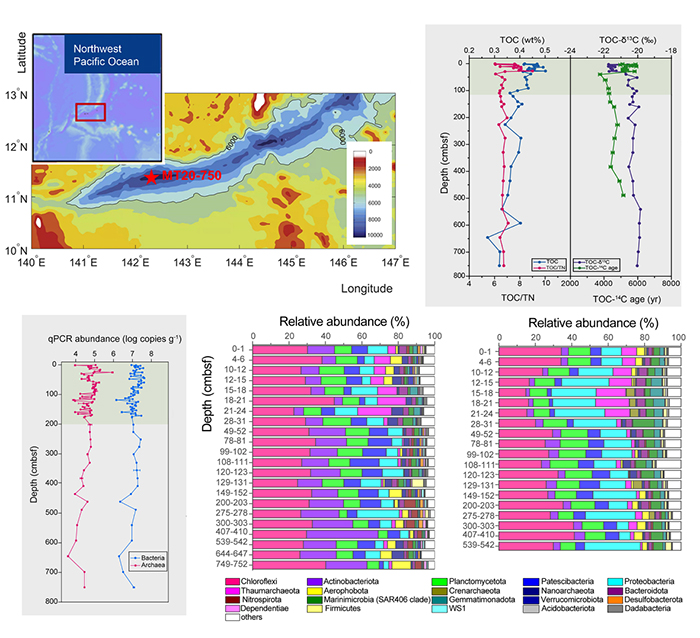 图1 马里亚纳海沟万米深渊沉积物采样站位、沉积物总有机碳δ13C和14C同位素含量及微生物丰度和群落组成的垂直变化