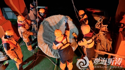 今天作业前,我们将网具搬到船尾舷口,并将缆绳连接上绞车,根据作业时长以及作业海区情况决定缆绳长度,放网和起网时还要有2名队员在舷口挂好安全绳协助网具入水并收回至甲板。这可真是一件力气活儿,队员们累得气喘吁吁,甚至一度“闪了老腰”,但是大家丝毫不敢懈怠。每次拖网入水到回收的3个小时里,我们一直怀着焦急与忐忑的心情,直至承载着丰硕样品的拖网出水。虽然身心非常疲惫,但是一切辛苦都值得!