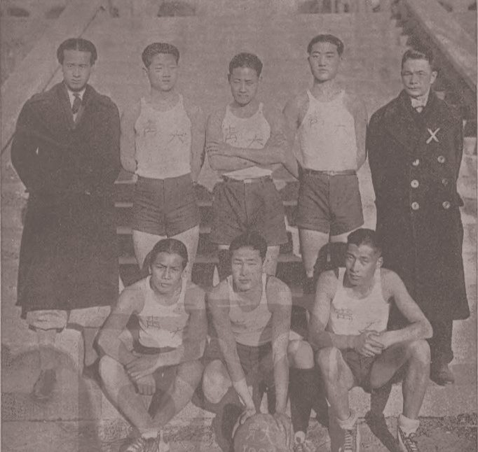 1928年11月青岛国际篮球锦标赛获胜的私立青大篮球队与指导教师凌道扬(后排左一)