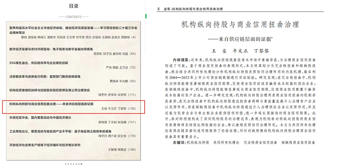 本站讯 近日,经济学院王垒教授(第一作者)和丁黎黎教授(通讯作者)合作撰写的论文《机构纵向持股与商业信用扭曲治理——来自供应链层面的证据》在《经济研究》2024年第7期发表。