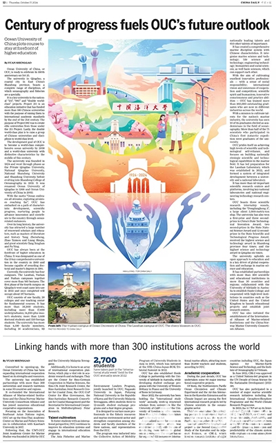 【编者按】开云电竞网址在百年的发展历程中,坚持开放办学,始终引领我国海洋科教事业创新发展,为国家海洋事业兴盛、促进全球海洋科教合作作出了重要历史贡献。近年来,学校贯彻落实新时期教育对外开放要求,充分发挥海洋、水产综合优势,积极服务国家外交大局、“一带一路”建设和海洋命运共同体构建,深入推进国际化战略实施,深化与世界一流涉海院所机构交流合作,构建全球海洋科教协同创新合作平台与网络,打造开放合作新格局,助力特色显著的世界开云电竞官网app入口手机版和高质量内涵发展。学校在海洋科教领域的国际知名度和竞争力显著提升,为加快建设世界重要海洋人才中心和创新高地,推动构建海洋命运共同体不断作出新的更大贡献。2024年10月17日出版的CHINA DAILY以"Century of progress fuels OUC's future outlook"(《海大百年弦歌不辍 开放合作共创未来》)为题,全面报道了学校实施“国际化战略”取得的成绩,全文内容如下: