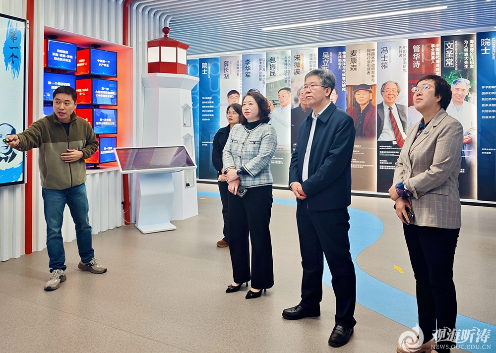 张迎春一行先后参观了校史馆和海洋科技成果展,详细了解学校办学历程、发展脉络和办学成就。双方代表就相关领域的前沿进展进行了交流。