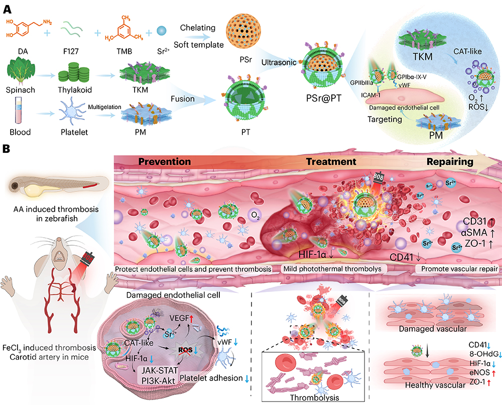 针对以上问题,研究团队成功研发了一种以病理微环境驱动为核心的纳米马达系统(PSr@PT NPs),该系统的核心由掺锶离子(Sr2+)的介孔聚多巴胺纳米颗粒(PSr NPs)构成,它既作为纳米马达的主体,也是氧化应激触发下释放Sr2+的储存库,同时还能清除活性氧。为了实现双重靶向推进,在PSr NPs表面整合一层由血小板膜(PM)和菠菜来源类囊体膜(TKM)组成的杂化膜。基于血小板膜的靶向性与类囊体膜的类过氧化氢酶活性,该结构能精准抵达血栓部位,并将H2O2分解为O2以驱动纳米马达自主运动,最终通过抑制炎症与氧化应激来减轻血小板-内皮粘附。在近红外(NIR)光照下,PSr NPs产生温和的光热效应(约40℃),通过直接热溶栓及增强纳米马达渗透实现双重溶栓效果。与此同时,从PSr NPs中可控的Sr2+释放可促进内皮再生与屏障修复,从而阻断血栓复发的恶性循环。该纳米系统在多种跨物种模型中均展现出普适性溶栓功效,包括斑马鱼花生四烯酸诱导的血栓模型和小鼠三氯化铁诱导的颈动脉栓塞模型。通过将植物光合膜的催化功能与哺乳动物系统的靶向精准性相结合,这种跨物种协同作用开创了仿生纳米技术的新范式。该仿生结构将生物信号传导(血小板-内皮识别)与物理刺激响应(光热驱动)有机融合,从而在促进深层血栓渗透的同时重塑微环境。这一多维度治疗策略将“瞬时溶栓”升级为“可持续血管功能恢复”,为精准抗血栓治疗提供了一个具有转化潜力的纳米平台。