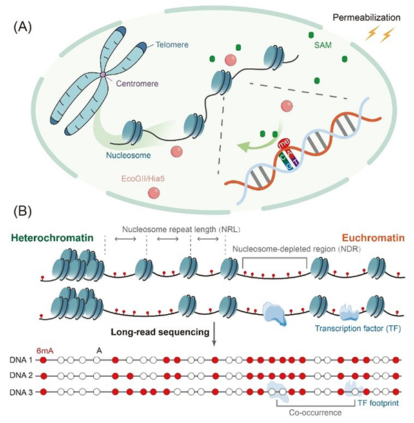 图2 利用6mA甲基化酶和三代测序绘制染色质环境图谱
