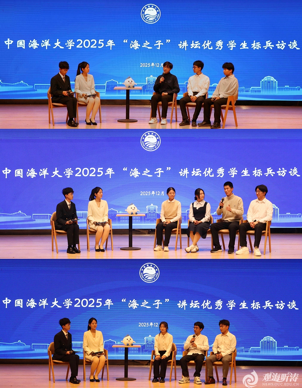 此次访谈由“浩海求索,逐梦深蓝”“知行合一,笃行致远”“奋楫争先,勇立潮头”三个篇章组成,10位优秀学生标兵围绕专业学习、学术科研、社会实践、创新创业、志愿服务等多个方面分享成长故事、传递青春感悟,展现了海大学子德才兼备、全面发展的卓越风貌。