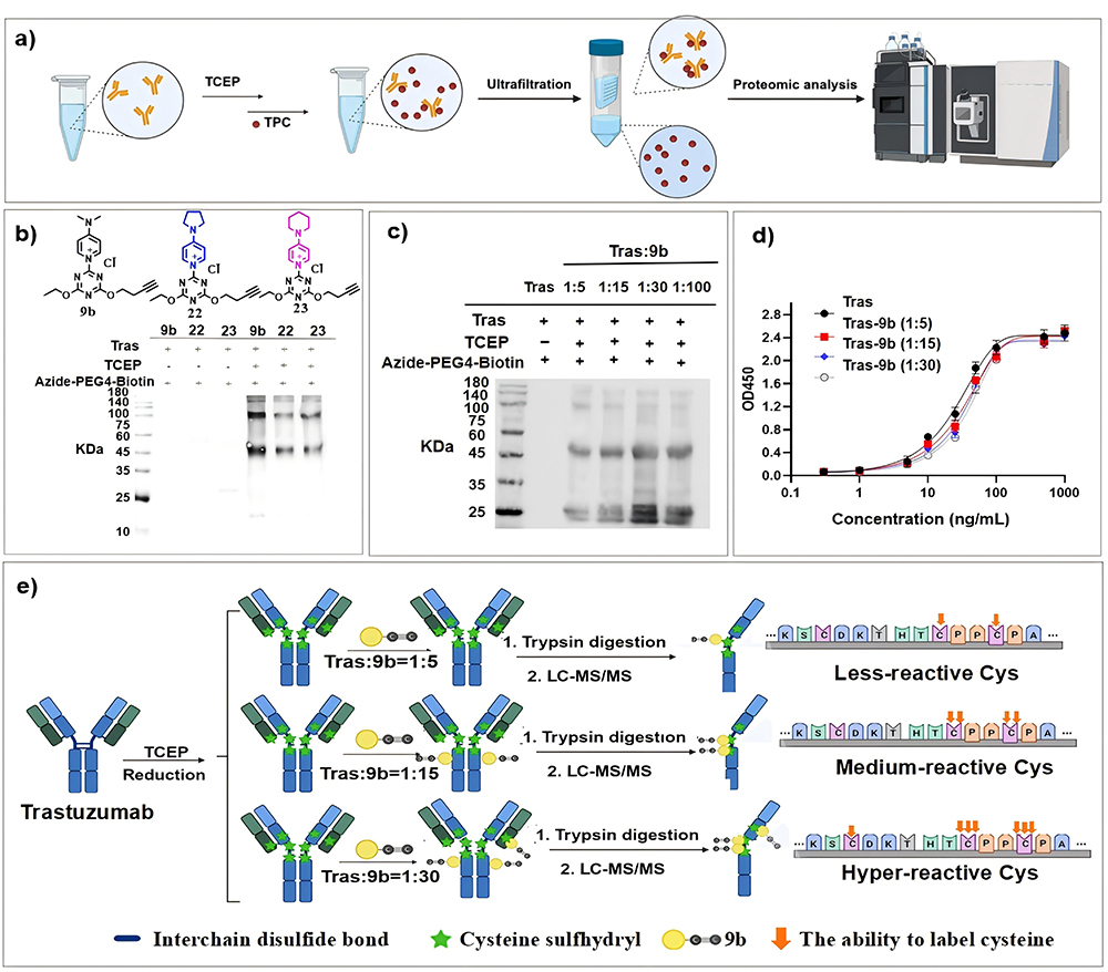 研究团队在2022年首次报道了能够选择性偶联酪氨酸的三嗪-吡啶鎓化学(TPC)探针,成功实现了在全蛋白质组水平上对酪氨酸的特异性标记(Chem. Commun., 2022, 58, 7066)。在本研究工作中,团队开发了一种在生理条件下能够对多肽/蛋白中半胱氨酸(Cys)实现选择性偶联的探针。机理研究表明,探针引入对位N,N-二甲基氨基吡啶基是实现这一高选择性的关键,且C-N键解离能与Cys选择性呈正相关,这为理性设计提供了理论依据。优化所得的最佳试剂9b成功应用于曲妥珠单抗的Cys选择性标记,可在还原条件下特异性修饰链间二硫键并保持抗体活性。该方法支持构建多位点、高载药量的ADC,其产物在人血浆中的稳定性显著优于传统方法,为开发新一代稳定、可控的生物偶联药物提供了新策略。