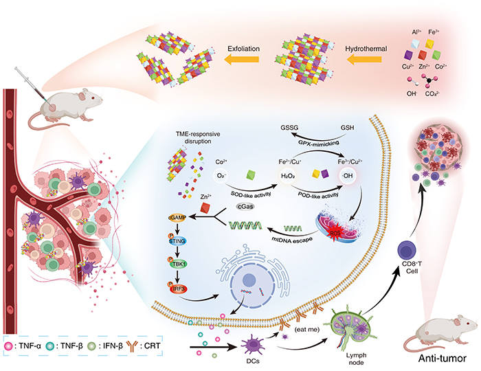 实验结果表明,HE-LDHs在TME中表现出类超氧化物歧化酶(SOD)、过氧化物酶(POD)和谷胱甘肽过氧化物酶(GPX)的模拟酶活性,可高效催化肿瘤代谢产物生成高浓度的活性氧(ROS),从而引发肿瘤细胞凋亡;此外,ROS诱导线粒体功能障碍并引发线粒体DNA(mtDNA)泄漏,而泄漏的mtDNA在锌离子的催化作用下激活cGAS/STING信号通路,进一步增强抗肿瘤免疫反应,促进细胞因子的分泌及淋巴细胞的成熟,从而有效抑制肿瘤的生长并防止复发。