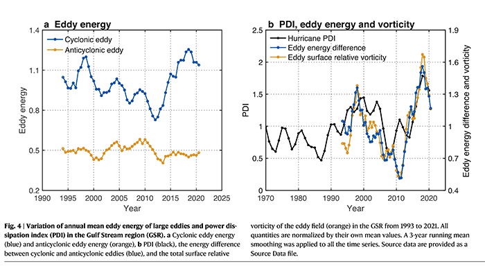 图:湾流研究区域中年平均的涡旋场和飓风强度的变化。(a)气旋涡(蓝色)和反气旋涡(橙色)年平均能量的时间序列。(b)飓风功率耗散指数(PDI,黑色),气旋涡和反气旋涡年平均能量差(蓝色)及涡旋海表相对涡度(橙色)的时间序列。