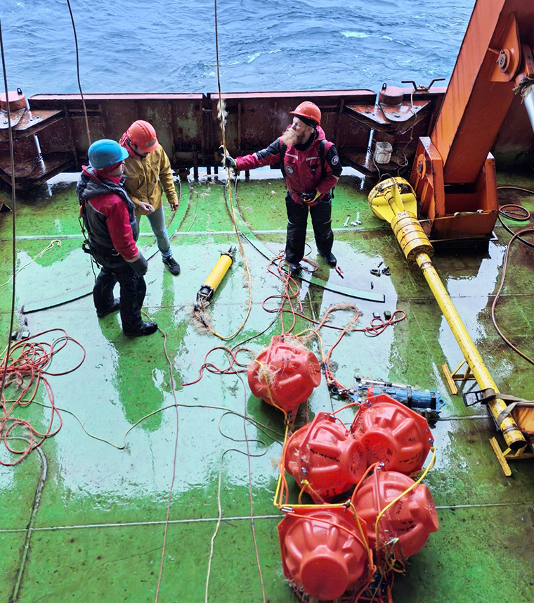 此次潜标回收工作得到国内外单位的大力支持。中国第41次南极考察环南极航次队长、中国极地研究中心高级工程师曹叔楠从航次开始之前就一直积极沟通协调,山东大学博士后刘宁华将回收潜标所用的甲板单元和配件带到巴西登船。最终在环南极航次俄方队长、俄罗斯南北极研究所(AARI)副研究员Nikita Kusse-Tiuz的指挥和组织下,中国、俄罗斯、巴西、智利、阿根廷、印度、秘鲁等国家考察人员共同努力,将潜标回收到“特里奥什尼科夫院士”号上。在航次已严重超时的情况下,资助方瑞士阿尔伯特冰冻圈基金会和考察船单位俄罗斯南北极研究所一致同意,放弃最后航段的原计划站位,将回收潜标工作作为航次最后的唯一任务,并且免除了由此产生的额外船时费用。此次成功回收潜标成为国际合作南极考察的典范。