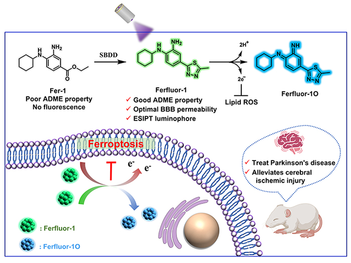 铁死亡(ferroptosis)是一种由脂质过氧化驱动的细胞死亡形式,与中风、帕金森病(PD)等神经系统疾病的发生发展密切相关。目前最常用的铁死亡抑制剂Ferrostatin-1(Fer-1)存在药代动力学性质差,难以穿透血脑屏障(BBB)等问题,严重制约了铁死亡相关机制研究和靶向神经系统的药物开发。在铁死亡化学生物学机制研究中,实时监测铁死亡进程的特异性荧光检测探针的设计仍存在巨大挑战。