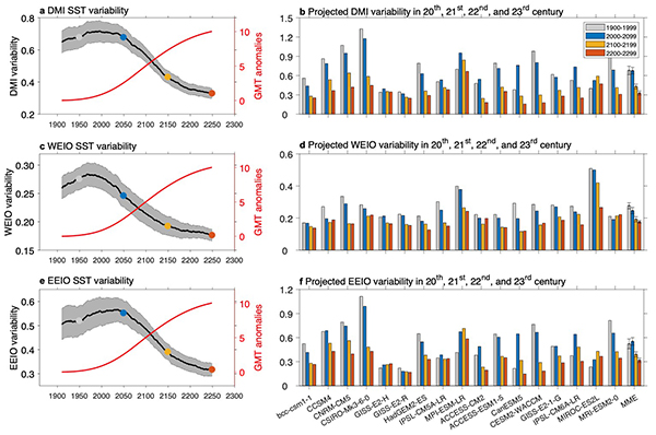 图1、印度洋偶极子(a, b),西热带印度洋(c, d)和东热带印度洋(e, f)海温变率从20世纪到23世纪的变化。