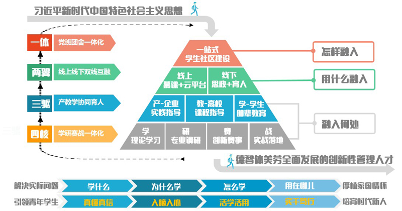 管理学院不断探索习近平新时代中国特色社会主义思想融入高校思想政治教育的创新路径,建设一站式学生社区“新阵地”,“党团班舍”一体化抓实育人最后一公里,解决怎样融入的问题;运用“线上+线下”的“新载体”,“双线混融”做好理论的阐释和传播,解决用什么融入的问题;“产教学”协同育人,将理论融入“学研赛战”思政教育“新模式”,思专创融合,贯穿教育实践全过程,解决融入何处的问题,形成了“大思政”格局下“一体两翼三驱四核”的“星火燎原”习近平新时代中国特色社会主义思想大学习领航工程,引导青年学生做到真懂真信、入脑入心、活学活用、实干笃行。2024年,管理学子用行动丈量祖国大地,用心灵感应时代脉搏,95.43%的学生投身创新实践,牵头项目获评教育部A类赛事国家级奖项21项,创历史新高。