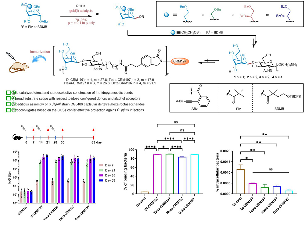 研究团队于2021年发展了制备稀有6-脱氧-庚糖氟苷的新方法,并采用间接构建1,2-顺式-β-D-艾杜糖苷键的策略,首次完成了空肠弯曲杆菌CG8486荚膜六糖的全合成(J. Am. Chem. Soc. 2021, 143, 11171-11179.)。继该重要工作后,研究团队利用金(I)催化的邻炔基苯甲酸酯糖苷化反应,首次建立了极具挑战性的β-D-艾杜糖苷键的普适性精准合成策略,适用于多种醇类受体与4种艾杜糖类(α-D-6-脱氧-艾杜庚糖、α-D-艾杜糖及D-/L-甘油型-α-D-艾杜庚糖)邻炔基苯甲酸酯给体的立体选择性β-糖苷化反应,最终实现了关键CG8486菌株荚膜二糖重复单元的多克级制备以及二糖、四糖、六糖及八糖糖苷的高效组装。精准合成了四种糖蛋白复合物(Di-CRM197、Tetra-CRM197、Hexa-CRM197、Octa-CRM197),并对其进行了系统的免疫学评价,结果表明糖蛋白复合物Di-CRM197与其他蛋白复合物具有同等免疫原性,从而推测结构最为简单的二糖可作为开发空肠弯曲杆菌疫苗的最小抗原表位。该研究不仅为含β-D-艾杜糖单元寡糖的高效合成建立了普适性方法,更为开发预防空肠弯曲杆菌感染的糖缀合物疫苗奠定了坚实基础。