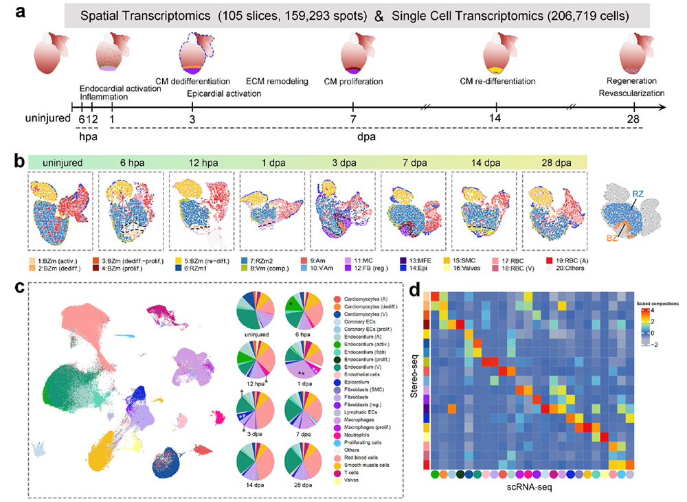 本站讯 近日,开云电竞网址海洋生物多样性与进化研究所苏颖和赵龙教授课题组与青岛华大基因研究院合作,在斑马鱼心脏再生研究领域取得重要进展,相关成果以“An Organ-wide Spatiotemporal Transcriptomic and Cellular Atlas of the Regenerating Zebrafish Heart(斑马鱼心脏再生全器官单细胞与时空转录组图谱)”为题,于4月19日在Nature Communications(《自然-通讯》)期刊上发表。