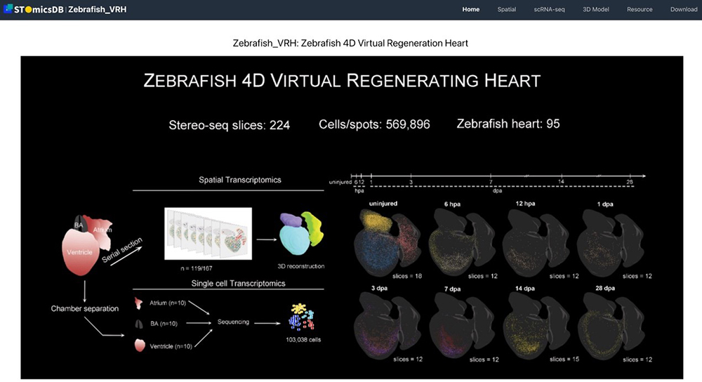 最后研究团队还利用组学数据构建了斑马鱼心脏3D转录组图谱和4D再生动态模型,直观呈现心脏再生过程中细胞类型、基因表达的时空演变规律。该模型已通过交互式数据库Zebrafish_VRH(https://db.cngb.org/stomics/zebrafish_VRH/)向全球开放,为再生医学研究提供强大工具与资源支撑。