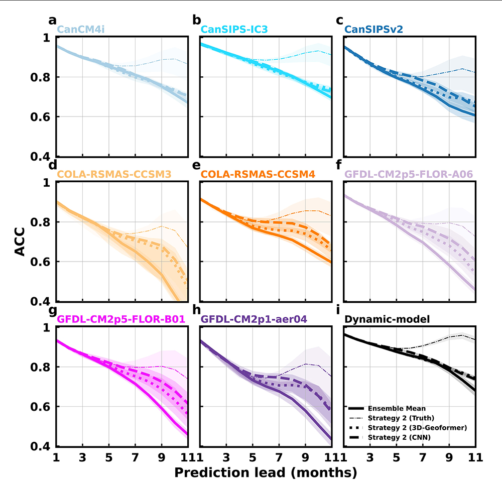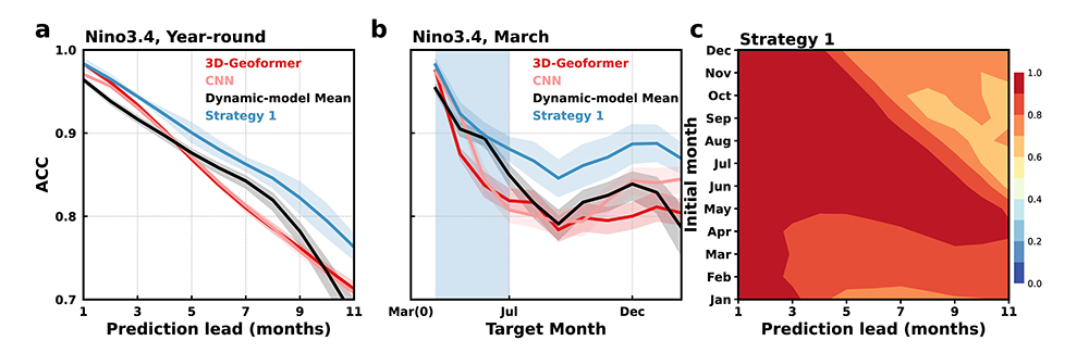 受多动力模式集合平均通过降低气候态偏差以提升ENSO预报能力的启示,研究团队进一步提出了两种DL模型与动力学模式的结合预报策略:策略1是对DL模型与多动力模式集合平均预报结果进行平均,相较于单独的两个DL模型和多动力模式集合平均,预报能力显著提升(分别提升了35.6%、51.5%和50.5%,图2);策略2则是通过DL模型筛选出动力学模式中初始场误差较小的子集成员,由此显著提升了单一模式的中长期(超过8个月)预报能力(提升了62.5%,图3)。研究进一步证实,两种策略对一系列预报期内的ENSO全年预报,特别是春季月份预报的提升均具有统计显著性。