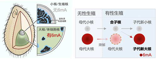 图1. 四膜虫是研究6mA从头甲基化的理想模式:在合子核发育为子代新大核的过程中,6mA完全从头建立。