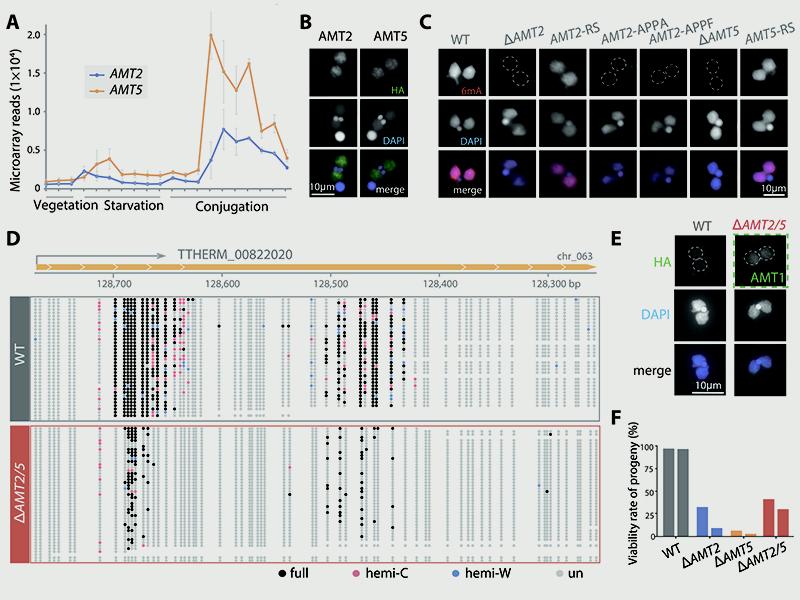 图2. AMT2和AMT5调控新大核中6mA的从头建立。(A)AMT2和AMT5在新大核发育时期高表达;(B)AMT2和AMT5定位在新大核;(C)AMT2/AMT5敲除导致新大核6mA水平下降,野生型AMT2/AMT5回补可使新大核中6mA水平恢复,突变回补不能使6mA水平恢复;(D)SMRT-CCS结果显示敲除株系中6mA位点数大量减少,甲基化水平显著下降;(E)敲除株系后代中AMT1蛋白水平相比野生型上调;(F)AMT2/AMT5敲除导致后代存活率下降。